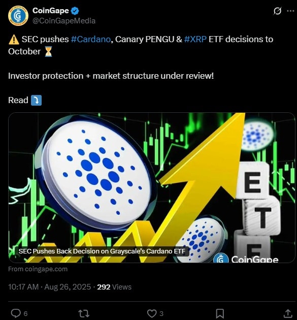 Na początku tygodnia SEC przełożyła termin rozpatrzenia trzech wniosków o dopuszczenie do obiegu funduszy spotowych. Chodzi m.in. o Cardano ETF od Grayscale. Od kilku tygodni rynek obstawiał, że 27 sierpnia usłyszymy pozytywną decyzję. Prawdopodobieństwo zatwierdzenia ADA ETF szacowano na ponad 80%. Jak widać, prognozy były błędne. Nowy termin na rozpatrzenie wniosku to 18 października.
