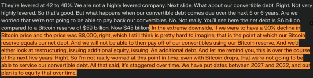 Z zapisu konferencji Saylora wynika, że poziomem ekstremalnego bólu dla firmy byłyby okolice 8 tys. USD za BTC ponieważ wtedy wartość rezerw BTC firmy zrównałaby się z jej długiem netto. Według Saylora ciężko sobie to wyobrazić i wymagałoby to ok. 90% spadku z obecnego poziomu.