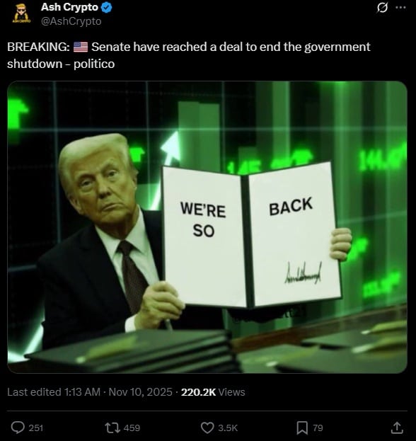 Rynek kryptowalut od ostatniego krachu z 10 października jest w ciągłym kryzysie, który dodatkowo pogłębiło zamknięcie rządu USA. Najdłuższy shutdown w historii USA sparaliżował działania administracja od najniższego do najwyższego szczebla. Swoje działania drastycznie ograniczyła SEC, co całkowicie zaburzyło harmonogram rozpatrywania ponad stu wniosków dotyczących kryptowalutowych. Najnowsze doniesienia sugerują, że Demokraci i Republikanie doszli do porozumienia w tej kwestii. Przywrócenie działania rządu USA po ponad 40 dniach przerwy może spowodować, że niektóre kryptowaluty wyraźnie odżyją.