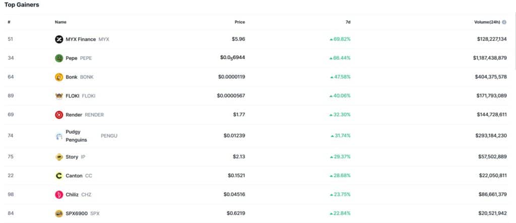 Od początku 2026 roku największy wzrost zyskał token MYX Finance. Altcoin wzrósł w ostatnich dniach o 69,82% i w szczytowym momencie zbliżył się do poziomu 7 dolarów. W momencie pisania tekstu kurs MYX wynosi 5,83 USD. Obrót w ciągu ostatnich 24 godzin przekroczył 128 milionów USD. Pod tym względem token również był jednym z liderów.