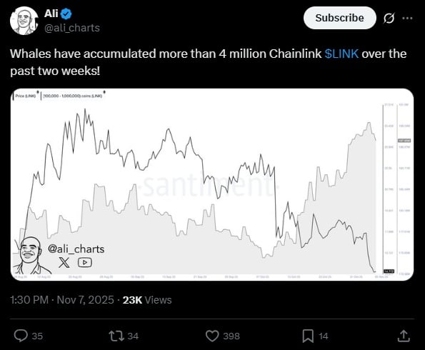 Jednym z tokenów, który przyciągał jak magnes, był LINK. Ali Martinez poinformował pod koniec tygodnia, że przez ostatnie dwa tygodnie duzi posiadacze kupili aż 4 mln sztuk Chainlink. Dane, które przedstawił ekspert, pochodzą z renomowanej platformy analitycznej „Santiment”. Rosnąca wiara w potencjał monety to prawdopodobnie skutek ostatnich partnerstw globalnych, które nawiązała firma.