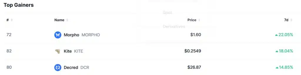 Największy wzrost, według danych CoinMarketCup, w zeszłym tygodniu wygenerował Morpho (MORPHO). Token w chwili pisania tekstu kosztuje 1,59 USD, a w ciągu ostatniego tygodnia czasie wzrósł o 22,05%. Od początku roku altcoin zyskał na wartości około 46%.