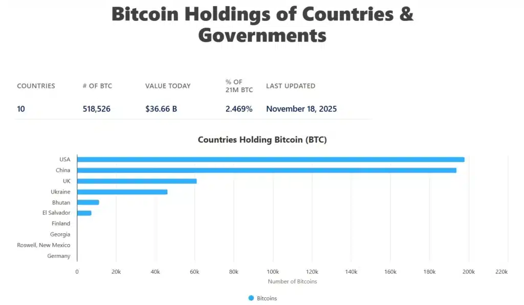 Największym posiadaczem wśród rządów jest USA. Amerykanie posiadają 198,012 BTC o wartości około 13,90 mld dolarów. Niewiele mniej posiadają Chiny. Pekin zgromadził 194 tys. BTC wartych na ten moment 13,62 mld dolarów. Podium zamyka Wielka Brytania, która ma już znacznie skromniejsze zasoby. Brytyjski rząd posiada w rezerwach państwowych 61,245 Bitcoinów, które warte są około 4,30 mld dolarów.