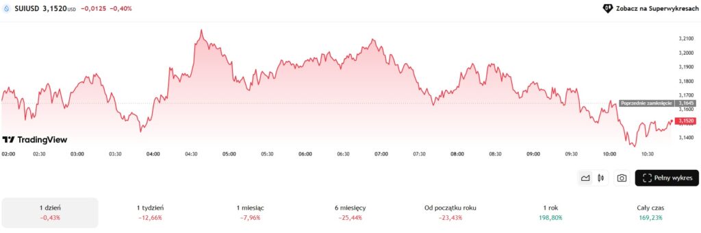 W chwili pisania tekstu SUI kosztuje 3,15 USD, a w ciągu ostatnich 24 godzin był raczej stabilny i nie wykonał żadnego zdecydowanego ruchu w żadną stronę (0,43%). Jednak w całym poprzednim tydzień był wyjątkowo nieudany. W ciągu ostatnich siedmiu dni altcoin spadł o ponad 12%. Złe wyniki token osiągnął również w całym poprzednim miesiąc, pomimo tego, że koniunktura była jeszcze całkiem sprzyjająca dla kryptowalut. Przez ostatnie trzydzieści dni SUI spadł o 7,96%. Od początku roku moneta straciła na wartości 23,43%.