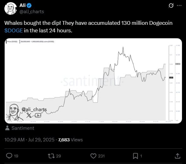 Ali Martinez w jednym z najnowszych postów na X poinformował, że wieloryby kupiły ponad 130 mln sztuk Dogecoina zaledwie w ciągu 24 godzin. Dane pochodzą z renomowanej platformy analitycznej Santiment. Ekspert ocenił, że wieloryby wyczuły okazję, by kupić token po spadkach. To sugeruje, że duzi gracze widzą szanse na wzrosty w niedalekiej przyszłości.