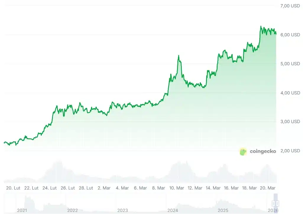 W ostatnich tygodniach uwagę przykuwa przede wszystkim DeXe. Ten token w ostatnich tygodniach wzrósł o ponad 160%. W chwili pisania tekstu token kosztuje 6,05 USD, a w ujęciu 24-godzinnym zyskał 0,8%. Z koeli w ujęciu tygodniowym i miesięcznym zyskał na wartości odpowiednio 45,21% oraz 167,26%. Od początku roku (Year To Date) altcoin wzrósł o 87,01%.