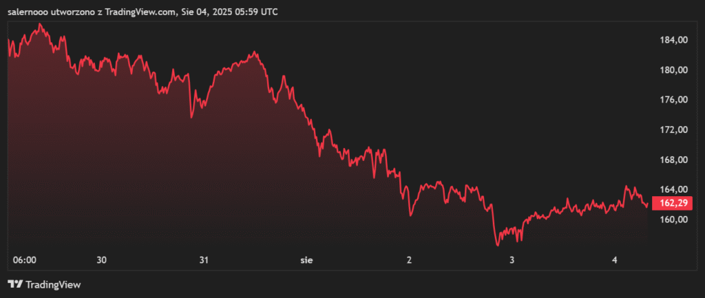 Dokładnie 23 lipca zdawało się, że przełom jest coraz bliżej. Że Solana pójdzie z prądem rynku i na dobre zadomowi się ponad poziomem 200 dolarów. Tymczasem przed bolid z logo SOL nieoczekiwanie wjechał safety car. Token najpierw spadł w okolice 180 dolarów, by potem zjechać poniżej 160 dolarów. Teraz spadki zostały wstrzymane – pytanie czy wsparcie wytrzyma.