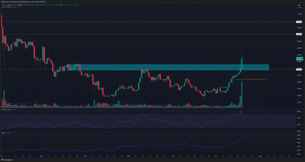 Wybicie ponad poziom 0,70 USD to silny sygnał byczy. Wielu traderów uznaje ten poziom teraz za wsparcie i szansę na ponowne wejście. Jednak tak gwałtowny wzrost może wymagać korekty. RSI wskazuje na możliwą „zadyszkę” rynku.