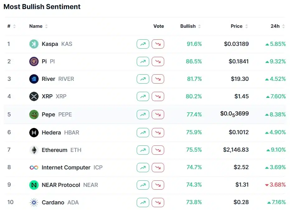 CoinMarketCup prowadzi ranking kryptowalut, do których rynek jest nastawiony byczo. Od kilku dni na szczycie listy niezmiennie widnieje Kaspa (KAS). W momencie pisania tekstu aż 91,6% rynku wskazuje na byczy sentyment w przypadku tego altcoina. W ciągu ostatniej doby wskaźnik dla KAS wzrósł o prawie 6%. To sygnał, że rynek upatruje w kryptowalucie jednego z przyszłych liderów wzrostów.