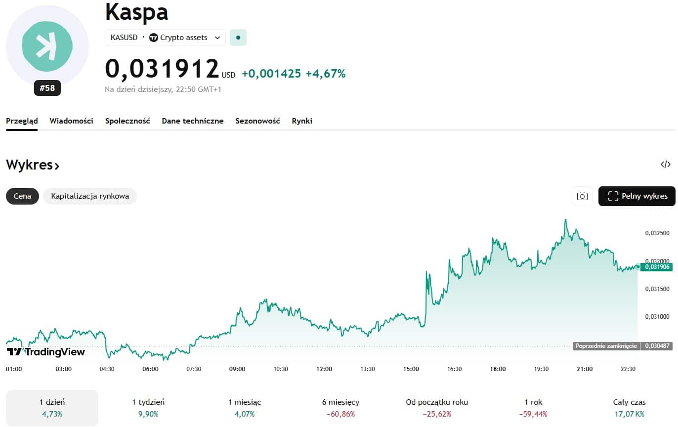 Z drugiej strony, jeśli wymienione czynniki rzeczywiście zadziałają jak katalizator kursu KAS, to może być dobry moment, by rozważyć zakup. W chwili pisania tekstu Kaspa kosztuje 0,03 USD, a w ciągu ostatniej doby wzrósł o 4,73%. Z kolei w ujęciu tygodniowym i miesięcznym alcoin zyskał odpowiednio 9,90% oraz 4,07%. Od początku roku (Year To Date) token stracił na wartości 25,62%.