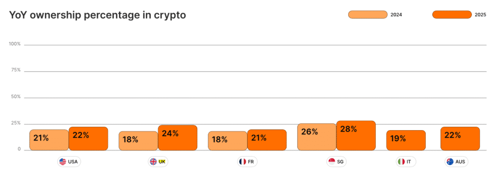 Ale Korea to tylko część szerszego trendu. Według raportu Gemini, w 2025 roku to Wielka Brytania zanotowała najszybszy wzrost udziału użytkowników kryptowalut. Przynajmniej na liście przebadanych krajów. Odsetek Brytyjczyków posiadających krypto wzrósł z 18% rok temu do 24% obecnie. To znacząca zmiana, zwłaszcza że UK wciąż nie ma gotowych pełnych ram regulacyjnych.