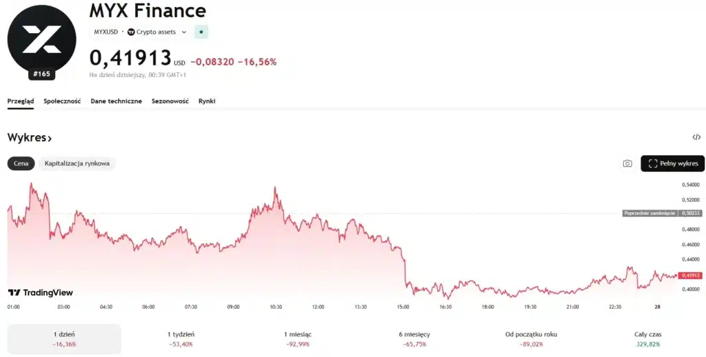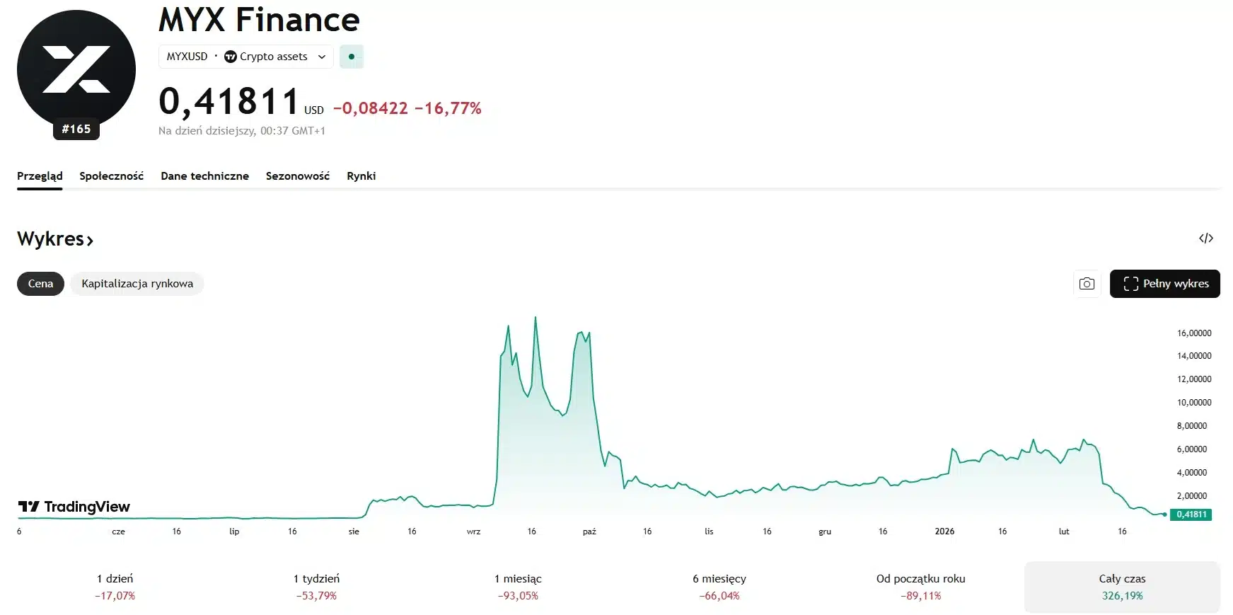 Na początku 2026 roku altcoin po chwilowym odbiciu od 7 lutego kontynuuje trend spadkowy. W chwili pisania tekst MYX Finance porusza się w przedziale 0,39-0,42 USD. W ujęciu tygodniowym i miesięcznym spadł odpowiednio o 51,40% oraz 92,99%. Tylko od początku 2026 roku token stracił na wartości blisko 90%.