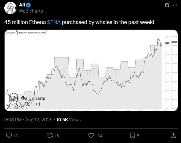 Ali Martinez w jednym z najnowszych wpisów na portalu X poinformował, że przez cały miniony tydzień wieloryby zakupiły aż 45 mln sztuk ENA. Dane, które przedstawił popularny ekspert pochodzą z renomowanej platformy analitycznej Santiment.