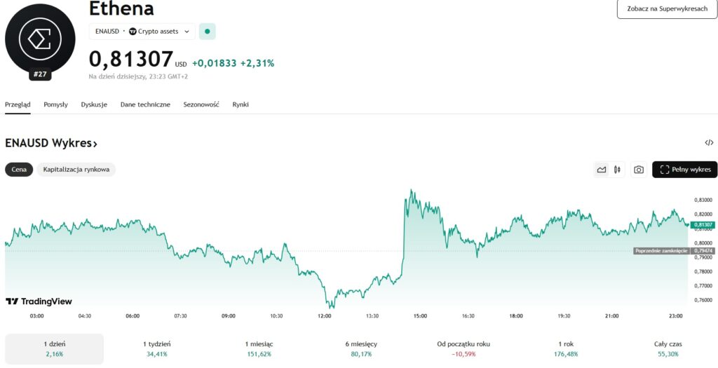 Wyniki, które w ostatnich tygodniach wykręca ten token, robią wrażenie. Projekt w tym czasie przyciągał również kapitał, co pozwoliło na awans o kilka pozycji w rankingu największych kryptowalut. Obecnie Ethena ma całkowitą kapitalizację rynkową na poziomie blisko 5,3 mld dolarów. Z takim wynikiem zajmuje w tym rankingu 25 pozycję. Przed nim jest Polkadot z wynikiem 6,7 mld. To spora różnica, ale tak rozpędzony projekt może szybko zmniejszyć ten dystans.