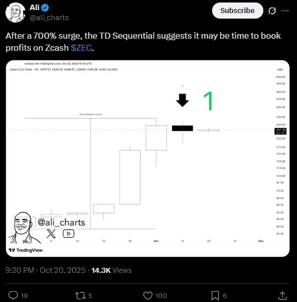 Widać zatem delikatne wyhamowanie w ostatnich dniach i okazuje się, że to może nie być przypadek. Wykresom ZEC bliżej przyjrzał się Ali Martinez. Ceniony analityk rynku kryptowalut nie ma wątpliwości. Jeden z jego najnowszych wpisów na X brzmi jak ostrzeżenie. Martinez alarmuje, że po wzroście o 700% wskaźnik TD Sequential sugeruje, że nadszedł czas na realizację zysków z Zcash.