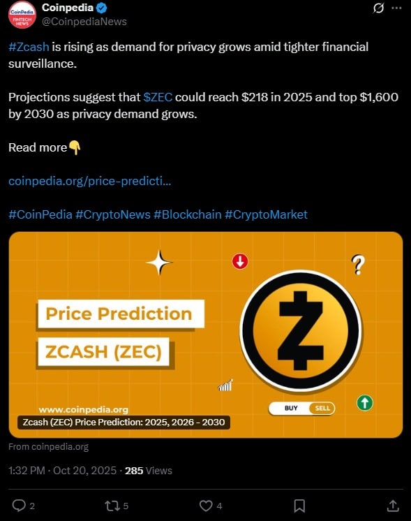 Z kolei Coinpedia ocenia, że Zcash może dalej zyskiwać, ponieważ coraz więcej użytkowników poszukuje prywatności w związku z rosnącym nadzorem finansowym. Portal podaje, że altcoin może do końca roku jeszcze spaść do 218 USD. Jednak w perspektywie długoterminowej, konkretnie do 2030 roku, ZEC może osiągnąć 1600 dolarów.