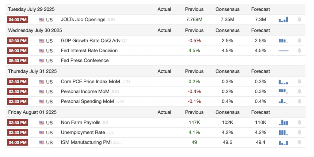 Kolejny punkt to wstępna prognoza PKB USA za II kwartał. Wzrost gospodarczy poniżej oczekiwań może zwiększyć niepewność, ale także przybliżyć moment cięcia stóp.