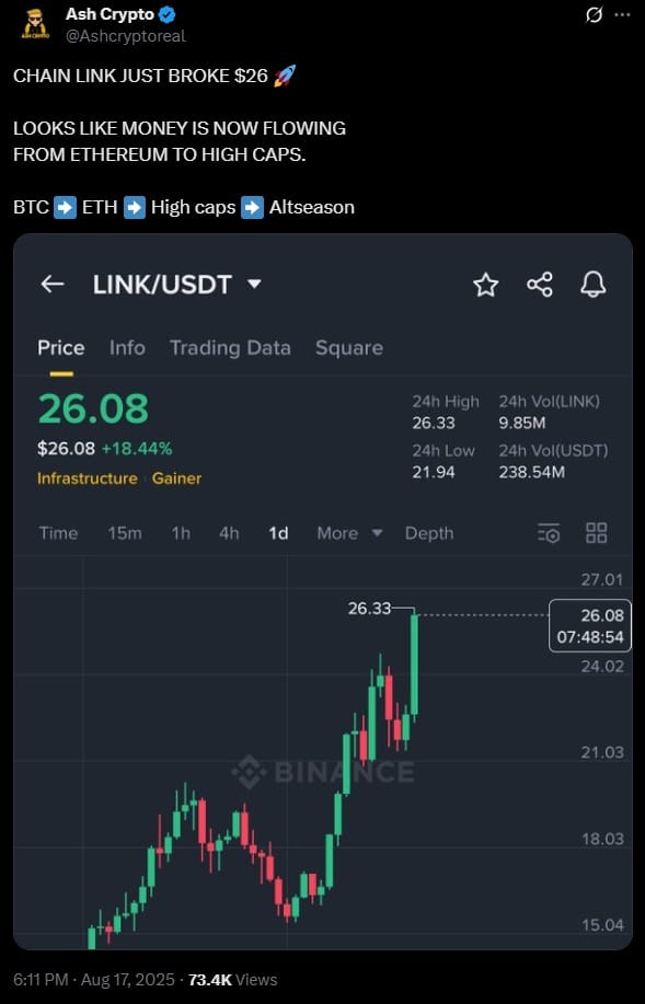 Ash Crytpo, popularny analityk rynku kryptowalut, po przebiciu 26 USD przez LINK: „Wygląda na to, że pieniądze przepływają teraz z Ethereum do walut o dużej kapitalizacji”. Na ten moment Chainlink jest 11. największą kryptowalutą pod względem kapitalizacji rynkowej. Jednak nie wszystkie tokeny z TOP 10 notowały podobne wyniki. Dlatego ocena eksperta wydaje się nieco przesadzona.