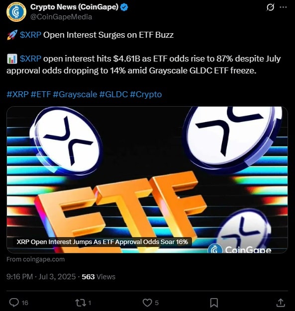 Najnowsze prognozy analityków dają nadzieję na realizację takiego scenariusza. Pomimo opóźnień w rozpatrzeniu XRP ETF od Grayscale, rynek pozostaje optymistyczny w tej kwestii. Jak informuje CoinGape na ten moment Ripple ma 87% szans na zatwierdzenie tego produktu. Jeszcze na początku było to ponad 90%. Portal zwraca również uwagę, że znacząco rośnie liczba otwartych kontraktów na XRP. Według Coinglass, otwarte zainteresowanie XRP wzrosło o 2,98% do 4,61 mld USD. Wolumen wzrósł o 8,26% do 7,73 mld USD