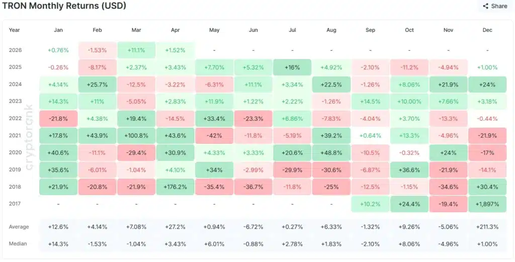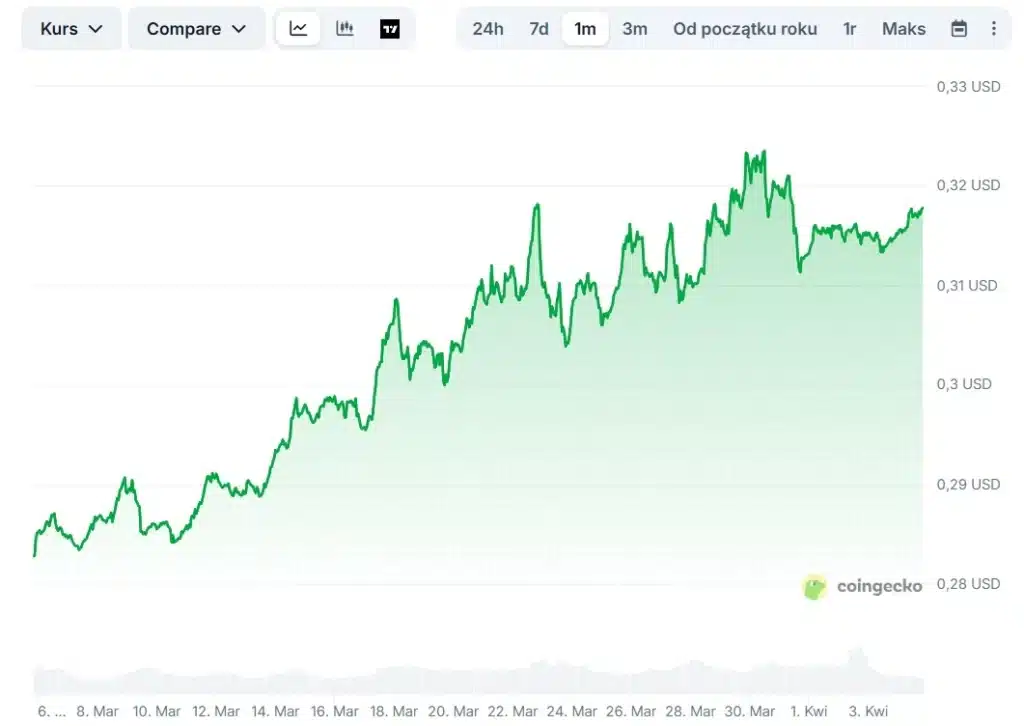 Tymczasem Tron tuż po krachu zaliczył miesiące spadkowe, ale szybko się pozbierał i w tym roku odjeżdża konkurencji. TRX tracił we wrześniu, październiku i listopadzie 2025 roku. W grudniu odbił, a w tym roku zaliczył tylko jeden spadkowy miesiąc. Słabszy moment pojawił się w lutym (-1,53%). Jednak już w marcu Tron mocno odbił (11,1%).
