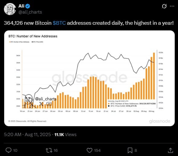Wygląda na to, że eksperci, którzy przedstawiali takie scenariusze, mogli być w błędzie. Najnowsze dane dotyczące aktywności w sieci BTC są bardzo optymistyczne. Jak poinformował Ali Martinez w jednym z najnowszych wpisów na X, że w ostatnim czasie dzienny wskaźnik nowych adresów w sieci Bitcoina osiągnął tegoroczny rekord. Każdego dnia w sieci powstaje średnio 364 126 nowych adresów BTC. Dane pochodzą z renomowanej platformy analitycznej Glassnode.