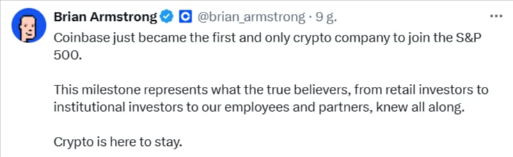 CEO Coinbase, Brian Armstrong, komentując wydarzenie na platformie X, podkreślił, że to dowód na trwałość i przyszłość rynku kryptowalut. „To potwierdzenie wiary wszystkich – od inwestorów detalicznych po instytucje i naszych pracowników – że krypto to przyszłość, która już nadeszła” – napisał.