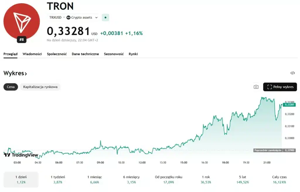 Mowa o tokenie Tron (TRX), który w chwili pisania tekstu kosztuje 0,33 USD i w ujęciu 24-godzinnym rośnie o 1,14%. Z kolei w ujęciu tygodniowym i miesięcznym altcoin zyskuje na wartości odpowiednio 3,87% oraz 6,66%. Jak jeden z niewielu projektów, TRX od początku roku (Year To Date) zyskuje na wartości. Na ten moment Tron w tym ujęciu zyskuje około 17%. Podobnie jest w przypadku całkowitej kapitalizacji rynkowej, która od początku roku również wzrosła o nieco ponad 17% i wynosi aktualnie 31,56 mld dolarów.