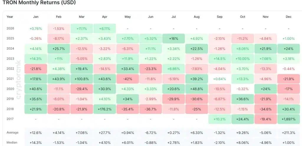 Tymczasem Tron od momentu krachu zanotował dwa miesiące spadkowe – w październiku i listopadzie. W grudniu i styczniu token się ustabilizował. W lutym zanotował kolejny spadek, po czym w marcu wyraźnie odbił (11,1%). Cały pierwszy kwartał 2026 roku Tron zakończył z zyskiem na poziomie 10,2%. Drugi kwartał roku dopiero się rozpoczął, ale na ten moment zapowiada się obiecująco (+6,32%).