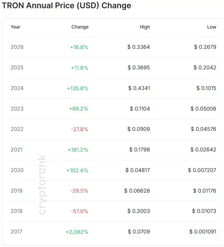 Bardzo imponująco wygląda również zestawienie rocznych wyników tokena Tron. Kryptowaluta funkcjonuje na rynku od dziewięciu lat. W tym czasie TRX tylko trzy razy kończył rok ze stratą wartości. W 2018, 2019 oraz 2022 roku altcoin tracił na wartości odpowiednio 57,9%, 29,5% oraz 27,8%. Sześciokrotnie altcoin kończył roku na plusie. Po pierwszym roku od debiutu moneta wzrosła o nieco ponad 2000%. Poza tym, aż trzy razy kończyła rok z trzycyfrowym wzrostem wartości: 2020 (102,4%), 2021 (181,2%), 2024 (235,6%). Od początku istnienia token zyskał na wartości ponad 16 000%.