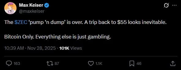 Na razie nie odstrasza to rynku i mało kto interpretuje to jako ostrzeżenie. Być może to błąd. Max Keiser w jednym z ostatnich postów na X ostrzegł przed możliwmy krachem ZEC. Ekspert ocenił, że schemat „pump and dump” ZEC dobiegł końca. Według analityka token zanotuje spadek do 55 dolarów i wydaje się nieunikniony. W odniesieniu do obecnych cen oznaczałoby to 88% krach. Kesier dodał również, że tylko Bitcoin ma sens, a wszystkie inne tokeny to „hazard”.