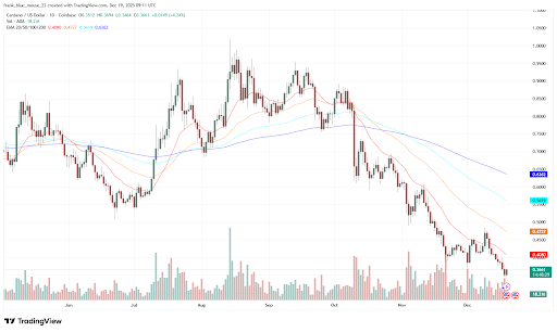 Cena Cardano nadal zmaga się z ciężarem szerszego trendu spadkowego.Cena ADA wKurs 0,36 USD pozostaje uwięziony w wielomiesięcznym kanale spadkowym, nie mogąc przebić się przez poziomy oporu wyznaczone przez główne średnie kroczące (EMA). 20-dniowa średnia krocząca (EMA) w okolicach 0,41 USD, 50-dniowa średnia krocząca (EMA) w okolicach 0,47 USD i 100-dniowa średnia krocząca (EMA) na poziomie 0,56 USD stanowią istotne bariery dla odbicia.