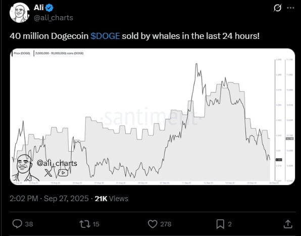 Jak poinformował Ali Martinez w jednym z ostatnich wpisów na X, tylko w ciągu 24 godzin (26 września) duzi posiadacze sprzedali łącznie 40 mln sztuk DOGE. Dane, które rozpowszechnił popularny ekspert, pochodzą z renomowanej platformy „Santiment”.