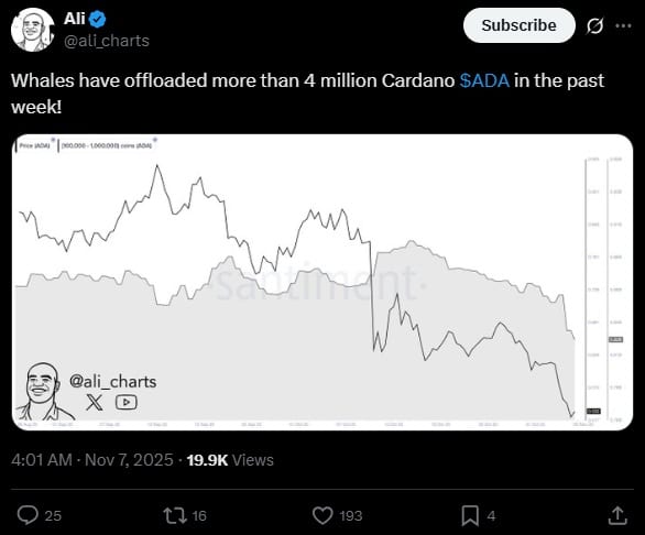 W jednym z najnowszych postów na X Ali Martinez poinformował, że przez cały ostatni tydzień wieloryby sprzedały aż 4 mln sztuk ADA. Dane, które przedstawił ekspert, pochodzą z renomowanej platformy analitycznej „Santiment”.