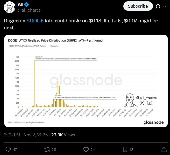 Nie wygląda to dobrze, a może być jeszcze gorzej. Alie Martinez w jednym z najnowszych postów na X ocenił, że najbliższa przyszłość Dogecoina może zależeć od utrzymania 0,18 USD. Ekspert ocenia, że jeśli to zadanie się nie powiedzie, kolejnym poziomem wsparcia może być 0,07 USD.