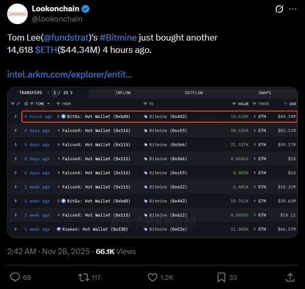 Niezależnie od warunków rynkowych firma, za którą stoi słynny strateg z Wall Street Tom Lee, od miesięcy stale powiększa swoje zasoby Ethereum. Tylko w tym tygodniu firma dokupowała token kilka razy. W poniedziałek 24 listopada podmiot kupił 28,625 sztuk Ethereum, na które wydał 82,11 mln USD.