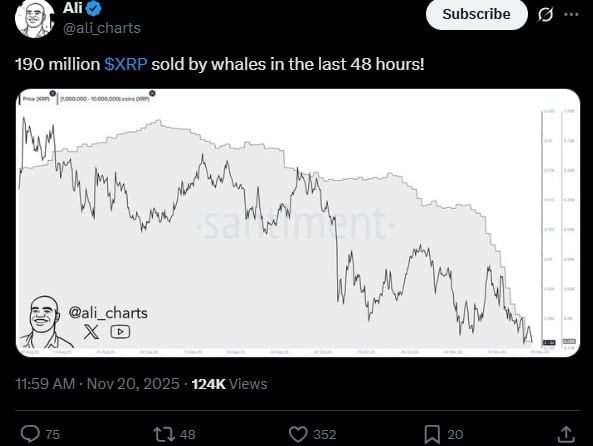 Przyczyn załamania kursu Ripple jest co najmniej kilka, ale jedna z nich przykuwa uwagę obserwatorów, ponieważ może zwiastować kolejne spadki. Chodzi o aktywność dużych posiadaczy. Jak poinformował Ali Martinez w jednym z ostatnich wpisów na X, tylko przez ostatnie dwa dni wieloryby sprzedały 190 mln sztuk XRP. To niepokojący znak, który sugeruje, że wieloryby nie widzą szans na odbicie po zakończeniu serii spadków.