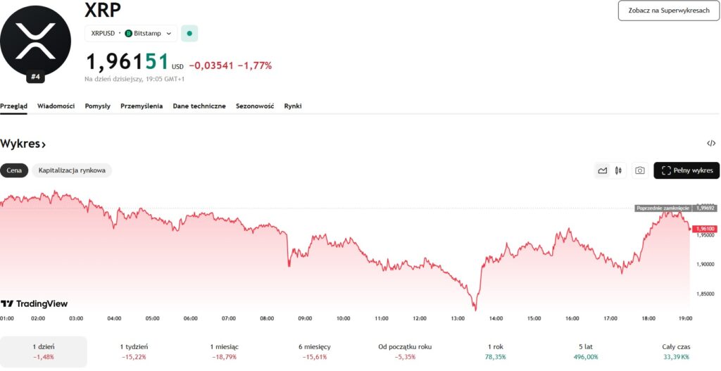 W ostatnich dniach XRP podążą śladami Bitcoina i mocno traci na wartości. W chwili pisania tekstu altcoin kosztuje 1,96 USD, a w ciągu ostatnich 24 godzin stracił około 1,48%. To kiepski wyniki, ale w krytycznym momencie token kosztował 1,82 USD. W ujęciu tygodniowym strata wynosi 15,22%. Natomiast przez cały ostatni miesiąc moneta spadła o 18,79%. Przez długi czas XRP wyróżniał się tym, że miał dodatni wskaźnik YTD (Year To Date). Jednak to już przeszłość. Na ten moment token od początku roku traci na wartości 5,35%.