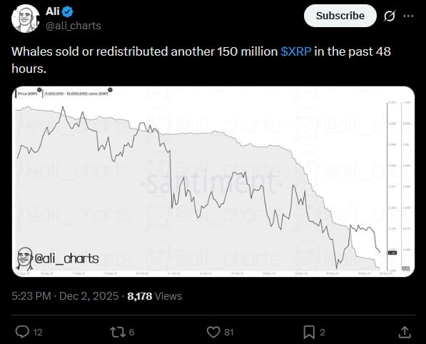 Lepsze wyniki w ostatnich dniach nie umknęły uwadze dużym posiadaczom. Wieloryby się uaktywniły, ale to raczej nie wróży nic dobrego dla projektu. Jak poinformował Ali Martinez w jednym z ostatnich postów na X, od początku tygodnia wieloryby sprzedały lub przeniosły kapitał w innej miejsce w przypadku 150 mln XRP.