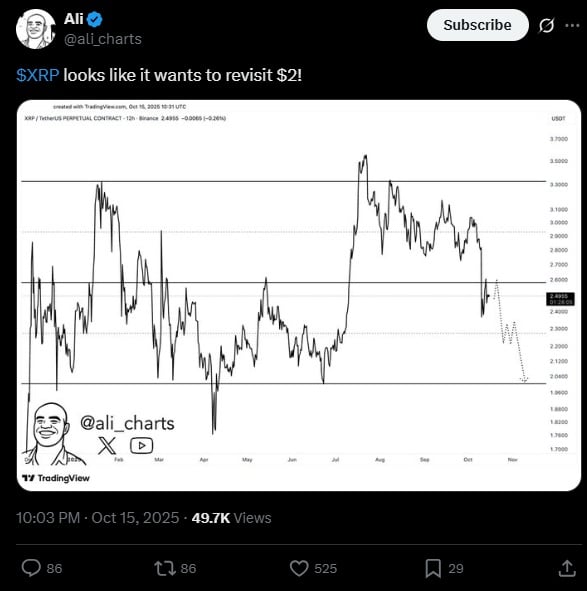 Chociaż jeszcze kilka dni temu token walczył o utrzymanie trzech dolarów, to za chwilę może znaleźć się poniżej dwóch. W jednym z najnowszych wpisów na X Ali Martinez wskazał, że ten scenariusz staje się coraz bardziej realny, a posiadacze XRP powinni mieć go na uwadze. Jak ocenił ekspert „wygląda na to, że chce wrócić do 2 dolarów”. W odniesienie do tegorocznego szczytu to spadek wartości o około 35%.