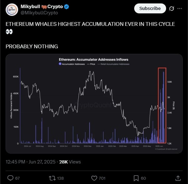 Ethereum wrócił do pewnego stabilnego poziomu, a rynek zdaje się wierzyć, że to tylko wstęp do większych wzrostów. Mikybull Crypto dostrzegł interesującą aktywność ze strony dużych graczy. Jak ustalił popularny ekspert rynku kryptowalut, wieloryby ETH właśnie ustanowiły rekord akumulacji w trwającym cyklu. Z wykresu, który zamieścił analityk, wynika, że wieloryby gromadzą wielokrotnie więcej Ethereum, niż w poprzednich miesiącach.