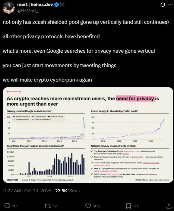Użytkownik mert w jednym z ostatnich postów na X zauważył, że w ostatnim czasie nie tylko Zcash, ale również inne tokeny prywatności zyskują na popularności. Wyniki z Google pokazują, że posiadacze kryptowalut coraz częściej szukają haseł takich jak „prywatność”.