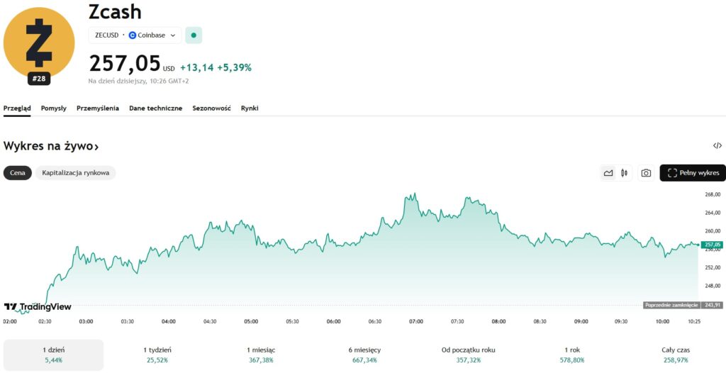 W chwili pisania tekstu ZEC kosztuje 257 dolarów, a w ciągu ostatnich 24 godzin wzrósł o 5,44%. Pomimo trwającego kryzys przez cały ostatni tydzień altcoin zyskał 25,52%. Z kolei w ujęciu miesięcznym token utrzymuje imponujący wzrost na poziomie 367,38%. Przez ostatnie pół roku moneta poprawiła notowania aż o 667,34%. Bardzo dobrze wygląda również wskaźnik YTD (Yerad To Date). Od początku roku kryptowaluta zyskała na wartości 357,32%.