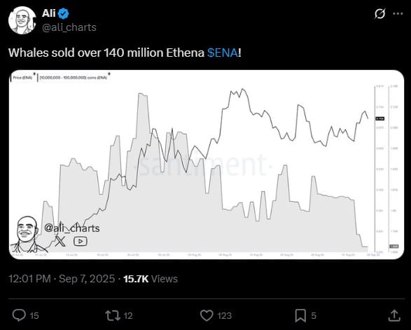 W jednym z najnowszych postów na X Ali Martinez ujawnił najnowsze ustalenia, z których wynika, że duzi posiadacze w ostatnim czasie sprzedali ponad 140 mln sztuk ENA. Dane pochodzą z tej samej platformy badawczej.