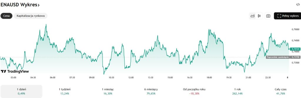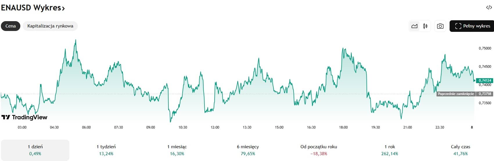 W momencie pisania tekstu Ethena kosztuje na giełdach około 0,74 USD, a w ciągu ostatnich 24 godzin token był stabilny i nie wykonał żadnego istotnego ruchu (0,84%). Z kolei przez cały ostatni tydzień moneta wzrosła o 13,56%. Natomiast w trakcie minionego miesiąca altcoin zyskał na wartości 16,73%.