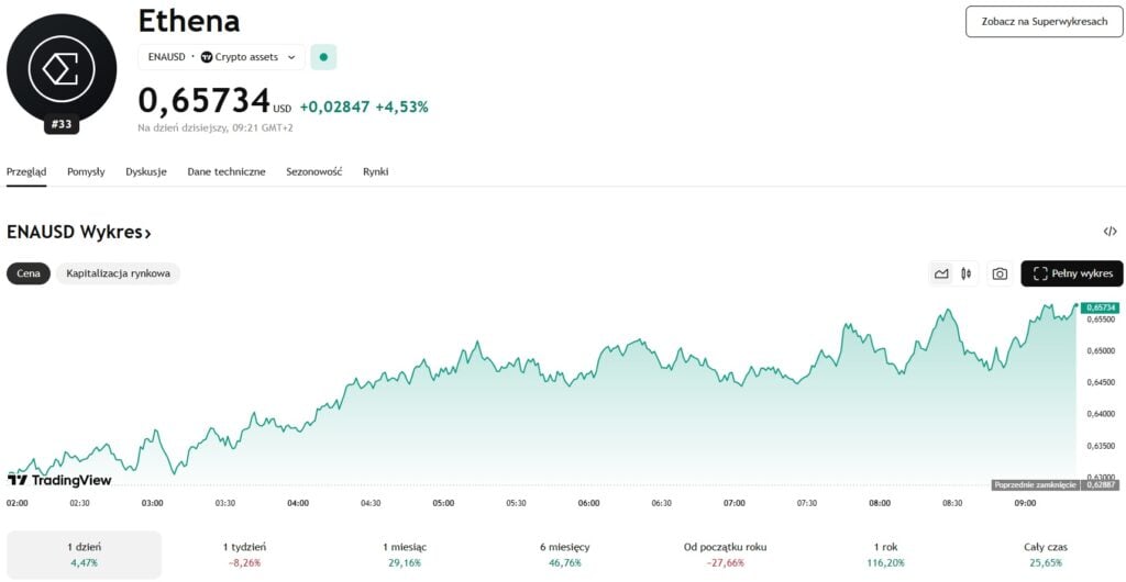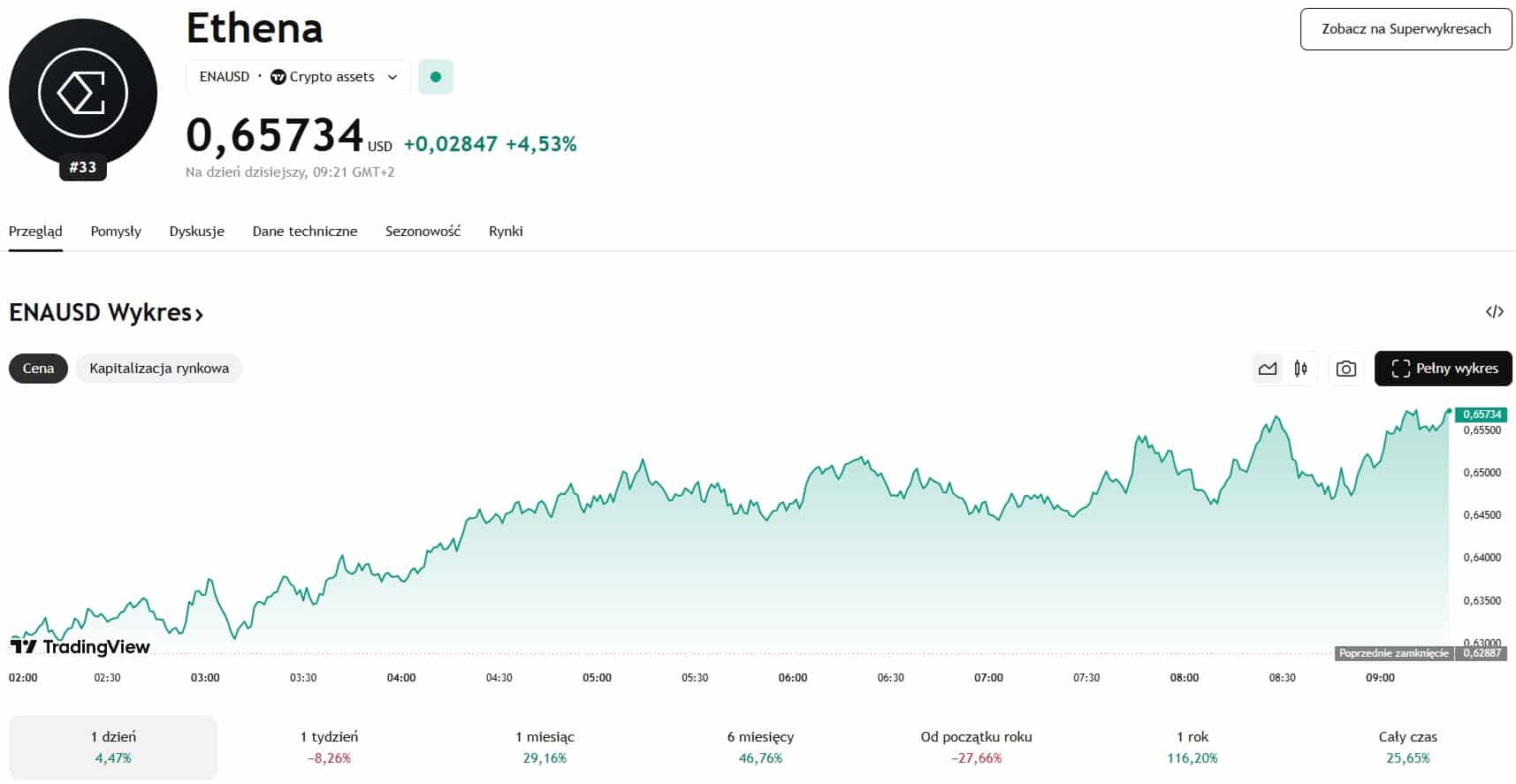 Obecnie sytuacja ENA uległa wyraźnemu pogorszeniu. W chwili pisania tekstu altcoin kosztuje 0,65 USD, w trakcie ostatniej doby wzrósł o 4,74%. Jednak przez cały tydzień kryptowaluta straciła na wartości 8,26%. Imponujący miesięczny wzrost stopniał do 29,16%. To spowodowało zwiększenie strat. Od początku roku Ethena traci na wartości 27,66%.