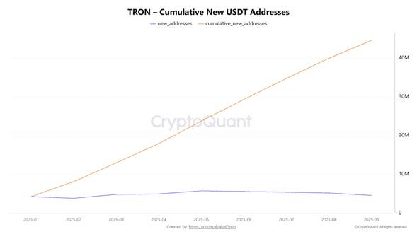 Kolejnym wskaźnikiem potwierdzającym tę tendencję jest wzrost liczby użytkowników. Według najnowszych danych CryptoQuant liczba unikalnych adresów, które wykorzystały lub otrzymały USDT w sieci TRON, osiągnęła 44,5 mln, co oznacza średni wzrost o 5 mln nowych adresów miesięcznie w 2025 r.