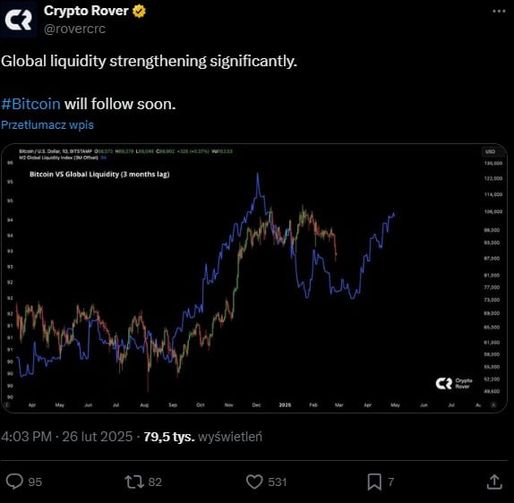Pomimo obecnej wyprzedaży, długoterminowe prognozy dla Bitcoina mogą okazać się bardziej optymistyczne. Wskaźnik globalnej podaży pieniądza M2 wskazuje, że w kolejnych miesiącach może nastąpić wzrost płynności, co historycznie sprzyjało Bitcoinowi i innym ryzykownym aktywom. Analityk Crypto Rover zauważył, że globalna płynność znacząco rośnie, a Bitcoin wkrótce podąży za tym trendem.