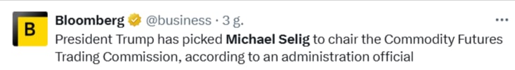 Prezydent Donald Trump zamierza nominować Michaela Seliga na nowego przewodniczącego Komisji ds. Handlu Kontraktami Terminowymi Towarowymi (CFTC), po wycofaniu wcześniejszej kandydatury Briana Quintenza.