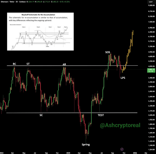 Ethereum nie tylko jest stabilne – po cichu przygotowuje się do gwałtownego ruchu. Analitycy wskazują na fazę reakumulacji Wyckoffa, która uformuje się w pobliżu 3850 dolarów, co odzwierciedla schemat wybicia ETH z 2021 roku.