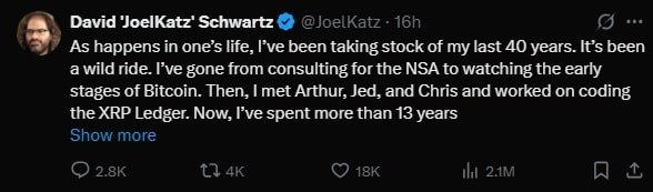 W swoim wpisie pożegnalnym, który Schwarz opublikował na X, wyraził wdzięczność dla kierownictwa Ripple oraz pozostałych współpracowników. Jednocześnie zapewnił, że odszedł z firmy, ale pozostaje wierny społeczności.